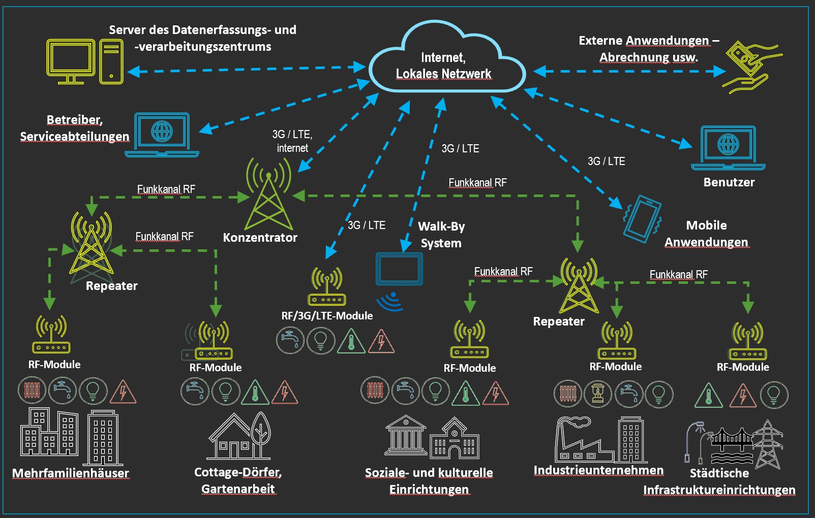 Die Informationen von den RF-Modulen werden in Echtzeit über den Funkkanal über ein Netzwerk von Repeatern und Konzentratoren an den Server des Datensammel- und Verarbeitungszentrums (DSVZ) übertragen. Benutzer greifen über das Internet auf den Server des DSVZ zu, um die benötigten Informationen auf Computern und Mobilgeräten abzurufen.