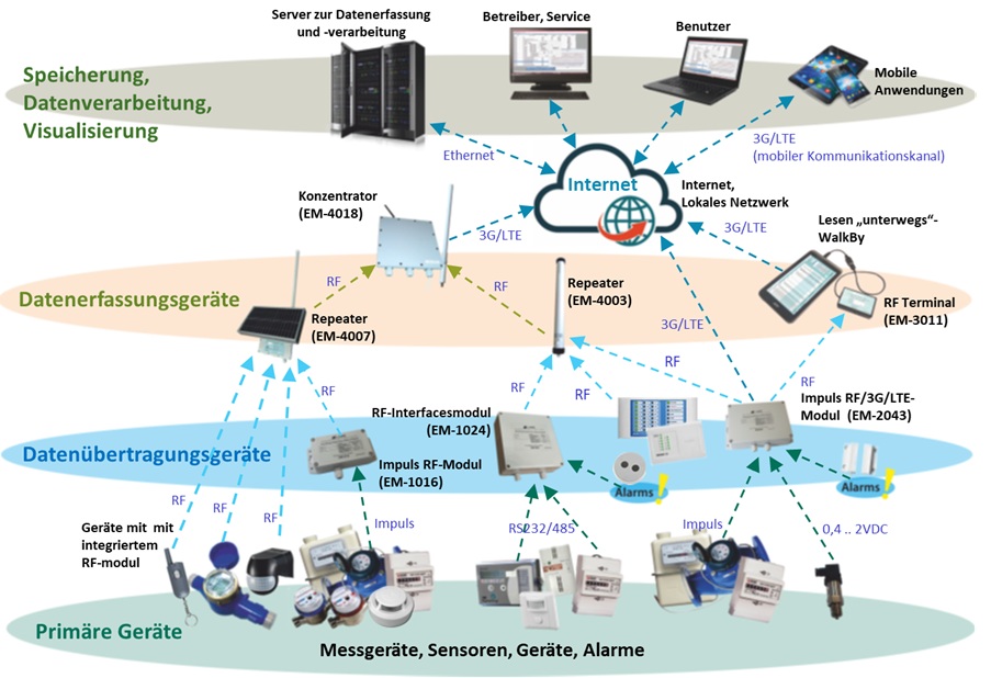 Ein vollständig drahtloses System auf Basis der EcoMatrix-Plattform mit Technologie zur drahtlosen Übertragung von Zählerständen (für Wasser, Wärme, Strom und Gas) und automatisierter Datenverarbeitung